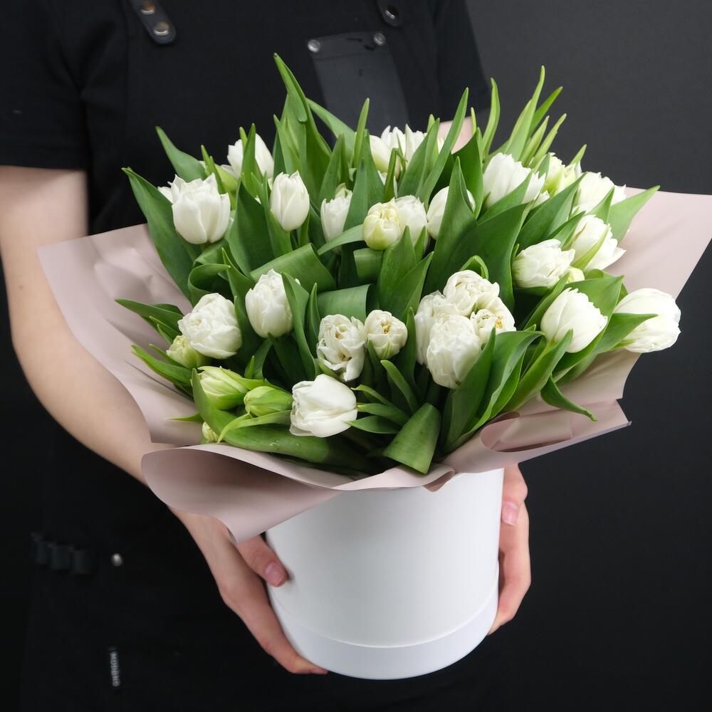 31 белый пионовидный тюльпан в шляпной коробке в Пучеже